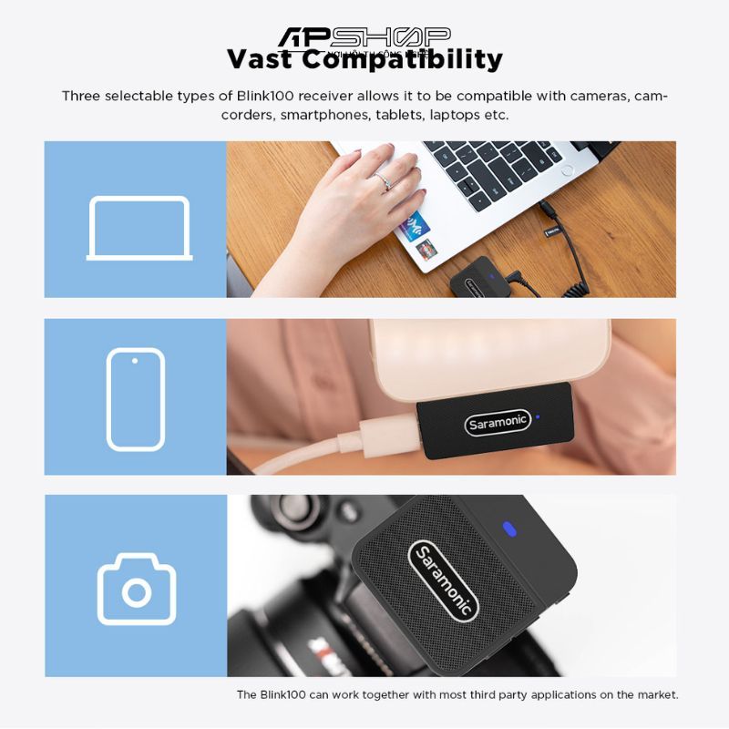 Tương thích với nhiều thiết bị: Sử dụng cổng 3.5mm, Blink100 B2 tương thích với nhiều thiết bị như máy ảnh, máy quay phim, điện thoại thông minh, máy tính bảng, laptop.