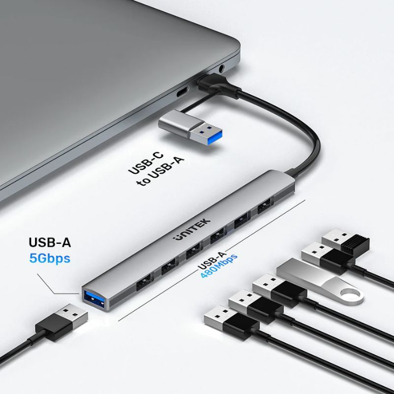 UNITEK uHUB S7 là bộ chia 7 trong 1, mở rộng từ một cổng USB-C thành bảy cổng USB-A với tốc độ lên đến 5Gbps. Nhỏ gọn và đa năng, sản phẩm hoàn hảo để tăng cường năng suất cho cả chuyên gia và sinh viên.