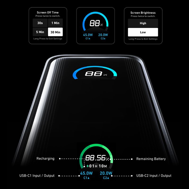 Cung cấp công suất đầu ra 65W mạnh mẽ cho dù sử dụng một cổng hay nhiều cổng cùng lúc, hoàn hảo để sạc nhanh máy tính xách tay ở chế độ pin hoặc chế độ sạc.